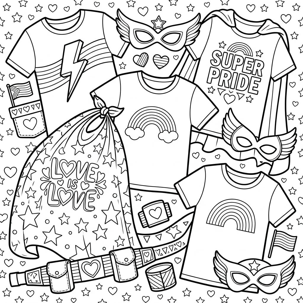 Get ready to color a powerful statement of heroism and love with this dynamic coloring page! Featuring an exciting collection of superhero apparel and accessories, you'll find t-shirts emblazoned with vibrant rainbows, a striking lightning bolt, and the uplifting message 'SUPER PRIDE.' Adorned with winged masks, a utility belt, and a flowing cape-like bag declaring 'LOVE IS LOVE,' each item is waiting for your creative touch. Look closely, and you'll even spot a small Pride flag, all set against a cheerful backdrop of stars and hearts.