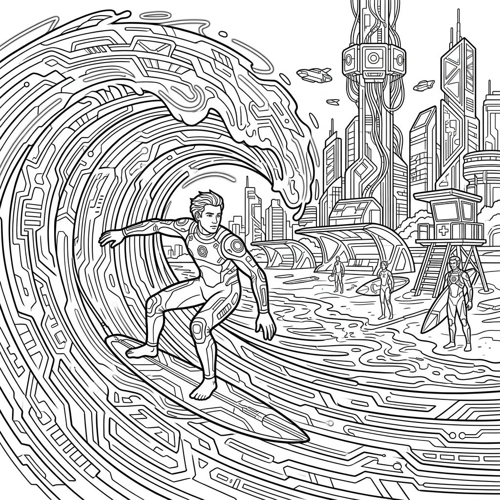 Unleash your creativity with this incredible coloring page, merging the raw energy of surfing with the sleek aesthetic of a cyberpunk future. Witness a surfer in a high-tech suit expertly navigating a massive wave, intricately designed with circuit-board patterns that ripple across its surface. The background reveals a stunning futuristic metropolis, complete with towering skyscrapers, advanced architecture, and even subtle flying vehicles, all detailed with signature neon-like outlines and robotic elements that beg for your vibrant touch.