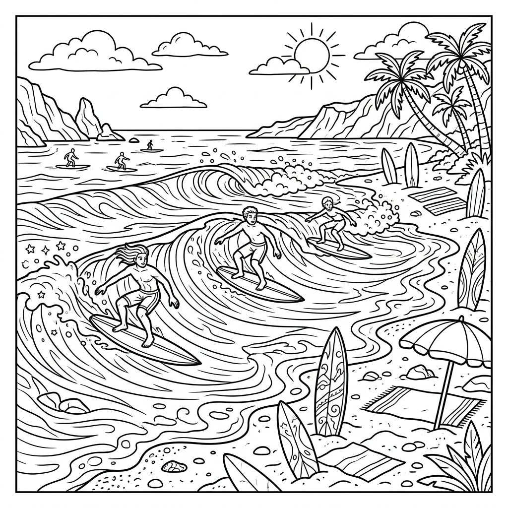 Dive into a vibrant coastal scene depicted in this detailed coloring page, showcasing the exhilarating world of surfing. The foreground is dominated by a powerful wave, with multiple surfers expertly riding its crest, their boards cutting through the foam. Further out, more tiny figures dot the horizon, indicating the expansive nature of this popular surfing spot. The sandy shore is adorned with classic beach elements: several surfboards stand upright, ready for action, alongside rolled-up beach towels and a welcoming beach umbrella, all beneath the swaying fronds of majestic palm trees. In the distance, rugged mountains frame the bay, adding to the picturesque backdrop, while a bright sun shines overhead, promising a perfect day.