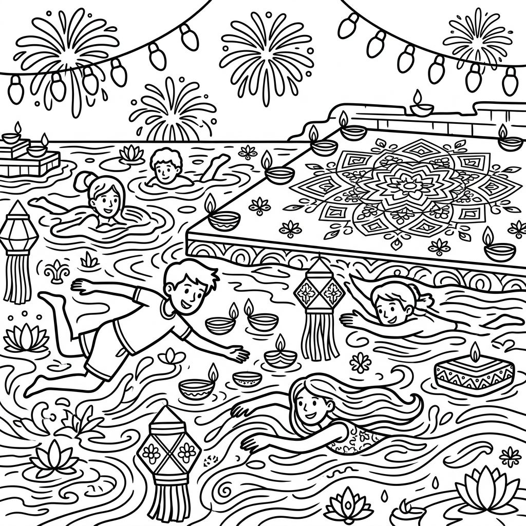 Bring this lively Diwali celebration to life with your favorite colors! Envision bright, shimmering hues for the water, warm golds and reds for the diyas and lanterns, and spectacular bursts of color for the fireworks. Encourage children to experiment with patterns on the rangoli and add their own creative touches to make this festive swimming scene truly shine. What a fantastic way to blend cultural learning with artistic expression!