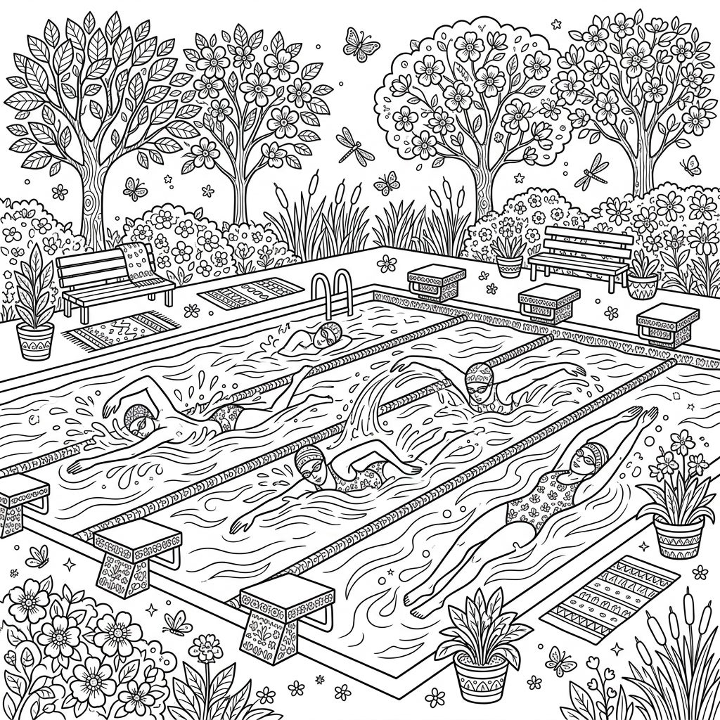 Dive into a beautifully detailed spring scene where the refreshing energy of swimming meets the gentle beauty of nature. This intricate adult coloring page showcases four dedicated swimmers gracefully navigating a pristine pool, each depicted in dynamic motion within their lanes. The aquatic action is framed by a lush, blossoming spring garden, complete with flowering trees, dense bushes, comfortable park benches, and charming potted plants. Delicate butterflies and dragonflies flit through the air, adding to the serene outdoor ambiance, all meticulously designed with patterns and elements to captivate the experienced colorist.