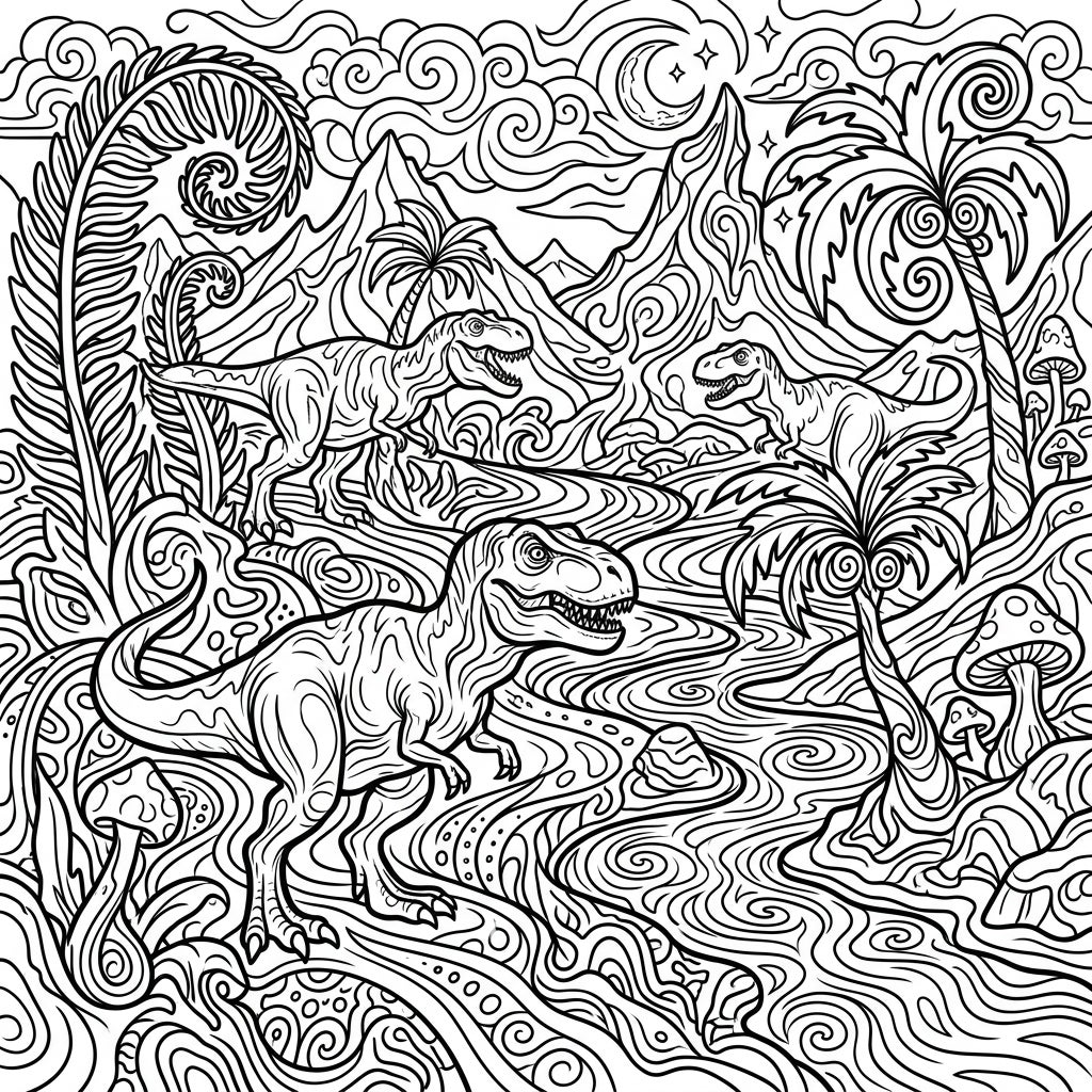 Prepare for an artistic adventure where the raw power of the Jurassic era meets a trippy, surreal aesthetic. The entire environment, from the flowing rivers to the mountainous backdrop under a crescent moon and twinkling stars, pulses with swirling, organic lines that challenge your perception and invite imaginative interpretation. This unique blend transforms the familiar prehistoric setting into an otherworldly experience, making it perfect for colorists seeking a creative escape that's both thrilling and meditative.