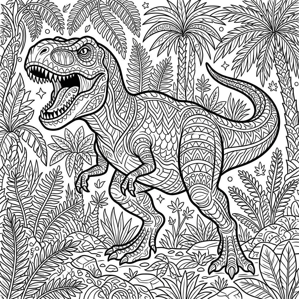 Embark on an epic coloring adventure with our intricately designed T-Rex hunting coloring page for adults. This captivating template showcases the mighty Tyrannosaurus Rex, rendered with stunning detail and filled with complex, meditative patterns across its scales. Surrounding this formidable dinosaur is a lush prehistoric jungle, rich with diverse ferns, towering palm trees, and rugged rocks, all waiting for your artistic touch.