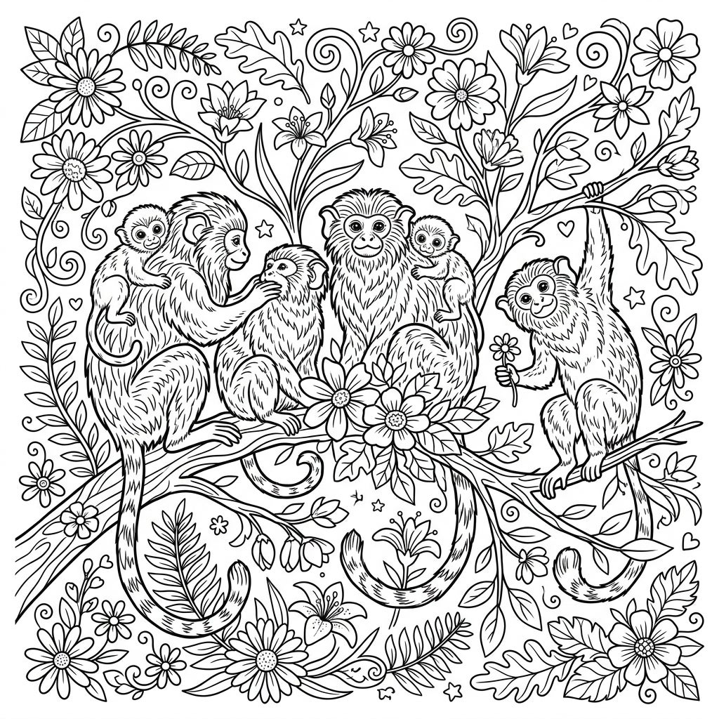 Step into a world of intricate beauty with this detailed coloring page, showcasing a loving tamarin family nestled within a bountiful spring environment. Observe five charming tamarins, including playful babies clinging to their parents' backs, and another reaching for a delicate flower. They are surrounded by a rich tapestry of blooming flowers like daisies and lilies, interwoven with spiraling vines, lush leaves, and subtle decorative elements that fill every corner of the design, ensuring a deeply engaging coloring journey.