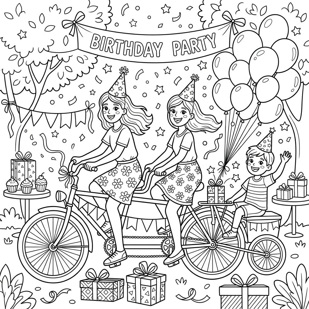This enchanting coloring page brings to life a joyful birthday celebration featuring a unique tandem bike. Two cheerful women, adorned with festive party hats, are pedaling a tandem bicycle, while a happy young boy, also wearing a party hat, waves from a charming sidecar. The scene is brimming with delightful details, including clusters of balloons, scattered confetti, decorative bunting, and beautifully wrapped gifts, all set against a backdrop of leafy trees.