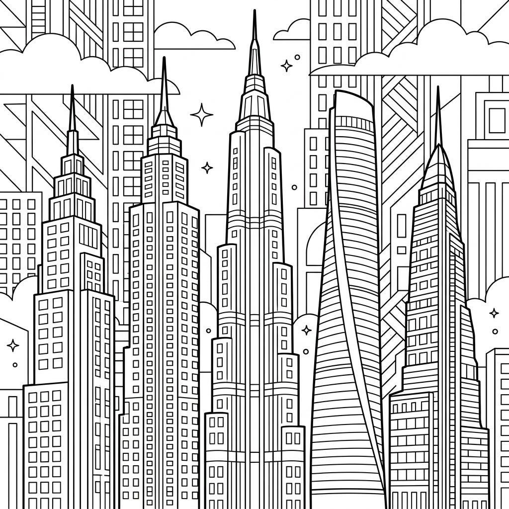 Whether you prefer realistic hues or a fantastical palette, this tapered skyscraper coloring page offers endless possibilities. Experiment with shading to create depth and dimension on the buildings' facades, or use contrasting colors to highlight different architectural elements. Consider a sunset gradient for the sky or add reflective qualities to the windows, making this complex cityscape truly your own masterpiece.