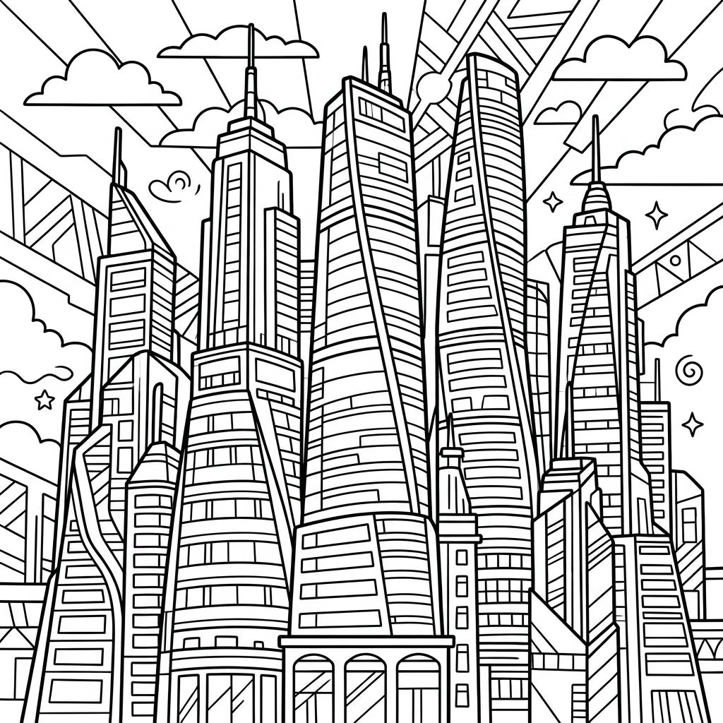 This full-page illustration offers a stimulating coloring experience, designed for both adult and teen colorists who appreciate architectural beauty and complex patterns. The linear art style ensures clean outlines, making it ideal for experimenting with shading, textures, and a vibrant palette to capture the energy of a thriving city. Imagine the sun glinting off glass facades or the warm glow of city lights emerging at dusk.