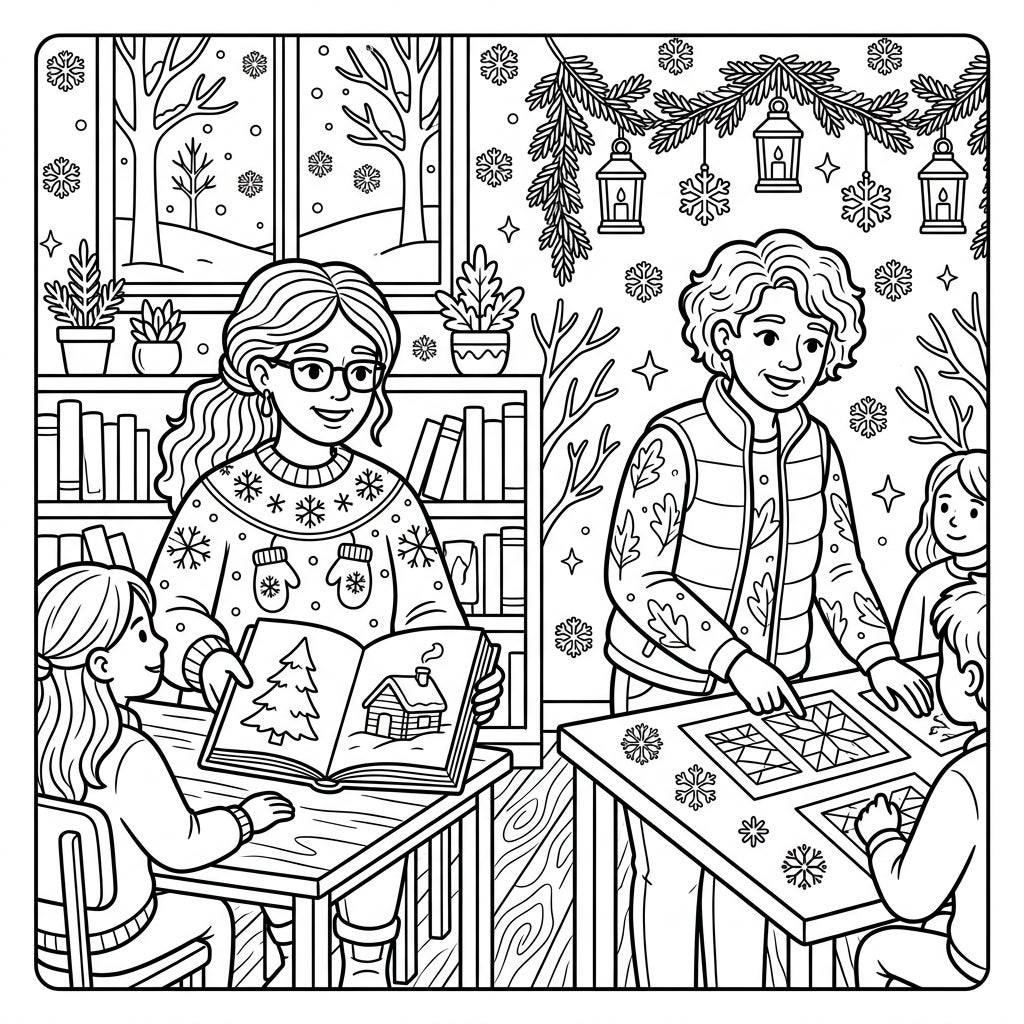 Step into a heartwarming scene with our detailed coloring page, showcasing the joy of winter learning. On the left, a kind teacher in a festive snowflake sweater reads a captivating storybook featuring a charming winter cabin and a snow-covered pine tree to an eager student. Behind them, bookshelves brim with knowledge, and through the window, a peaceful snowy landscape with bare trees and falling snowflakes sets the serene mood. On the right, another inspiring educator guides two children through a creative craft activity, with snowflake designs adorning their table, all under the cheerful canopy of a winter garland strung with lanterns and more delicate snowflakes.