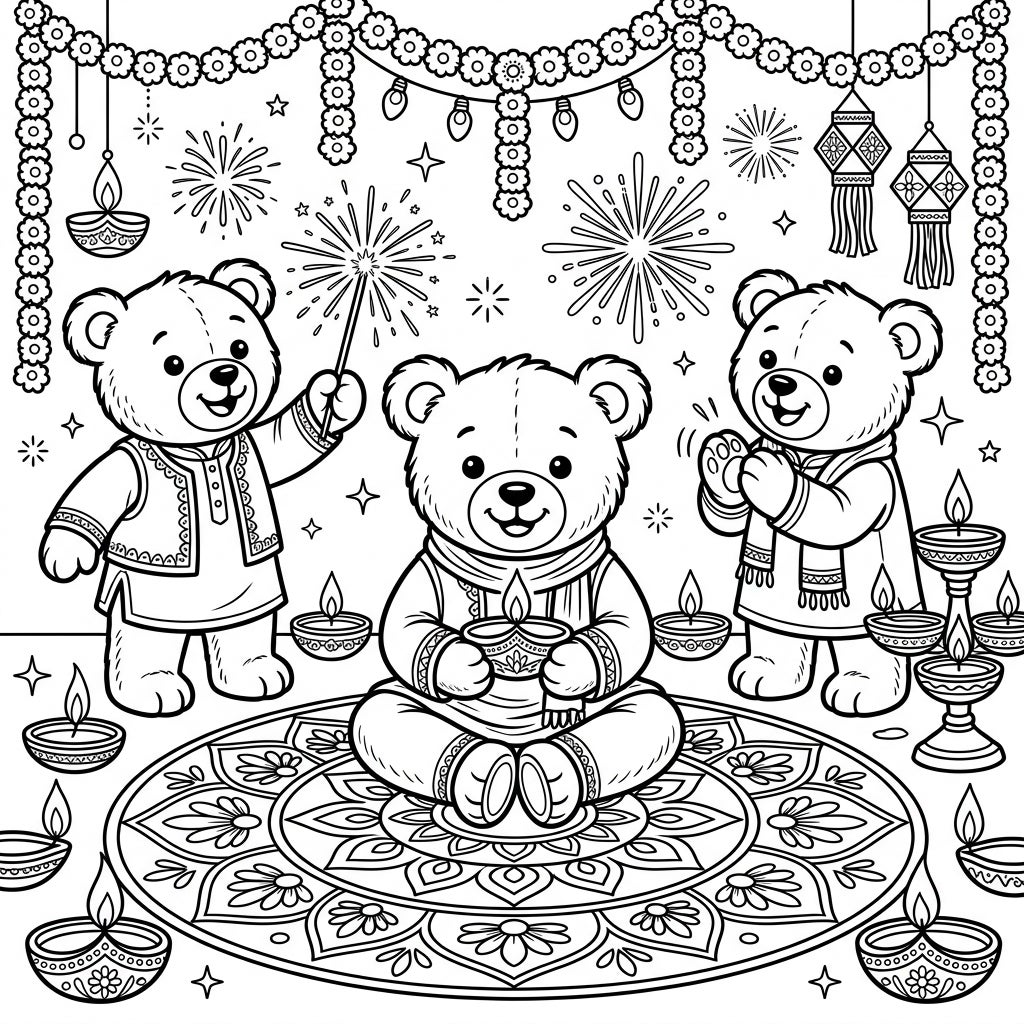 Join three charming teddy bears as they celebrate the vibrant Festival of Lights with diyas, sparklers, and intricate rangoli. This delightful coloring page captures the heartwarming spirit of Diwali, perfect for spreading festive cheer.