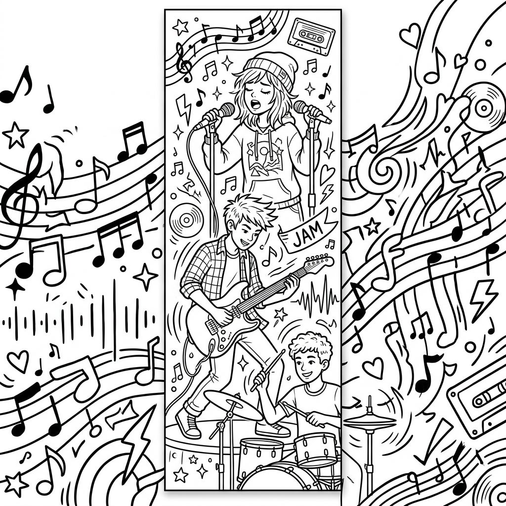 Capture the thrilling essence of a live jam session or an exciting band practice with this captivating design. It evokes the spirit of youth, passion for music, and the joy of creating together. This bookmark isn't just about coloring; it's about celebrating the power of sound and self-expression, making it an ideal project for anyone who loves music, concerts, or just the pure, unadulterated fun of a good beat.