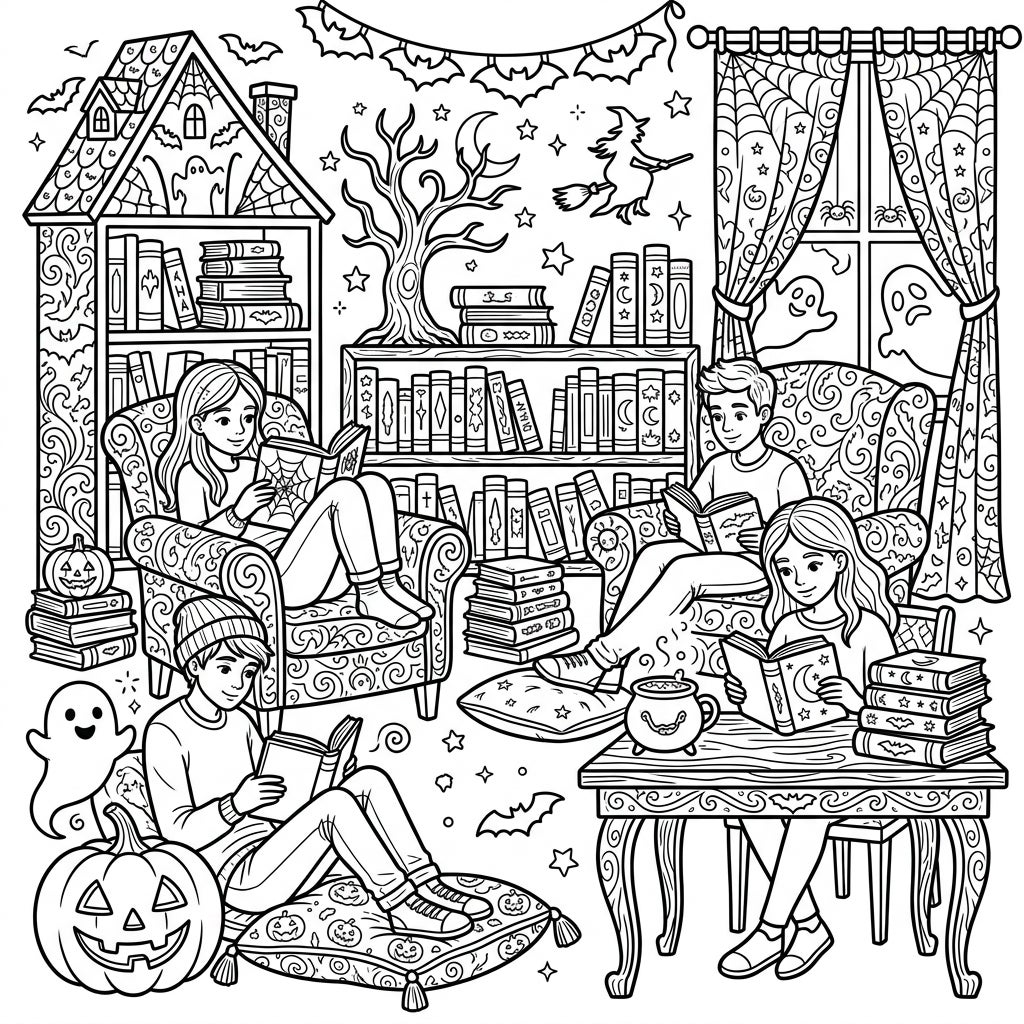 Combine your love for reading and the spooky season with this engaging coloring page featuring teenage readers. It's filled with fun Halloween decorations and cozy reading nooks, perfect for a relaxing creative session.