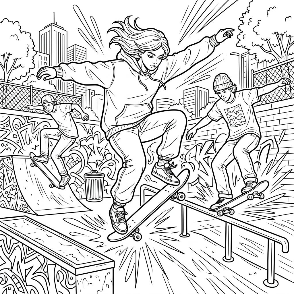 This scene perfectly captures the vibrant energy and spirit of youth culture, set against an exciting urban backdrop filled with graffiti, city buildings, and fences. It’s an ideal way to explore the world of skateboarding, encouraging young artists to imagine the sounds of wheels on pavement and the thrill of landing a perfect trick. It's not just a coloring page; it's an invitation to channel their inner creativity and bring this lively street scene to life.