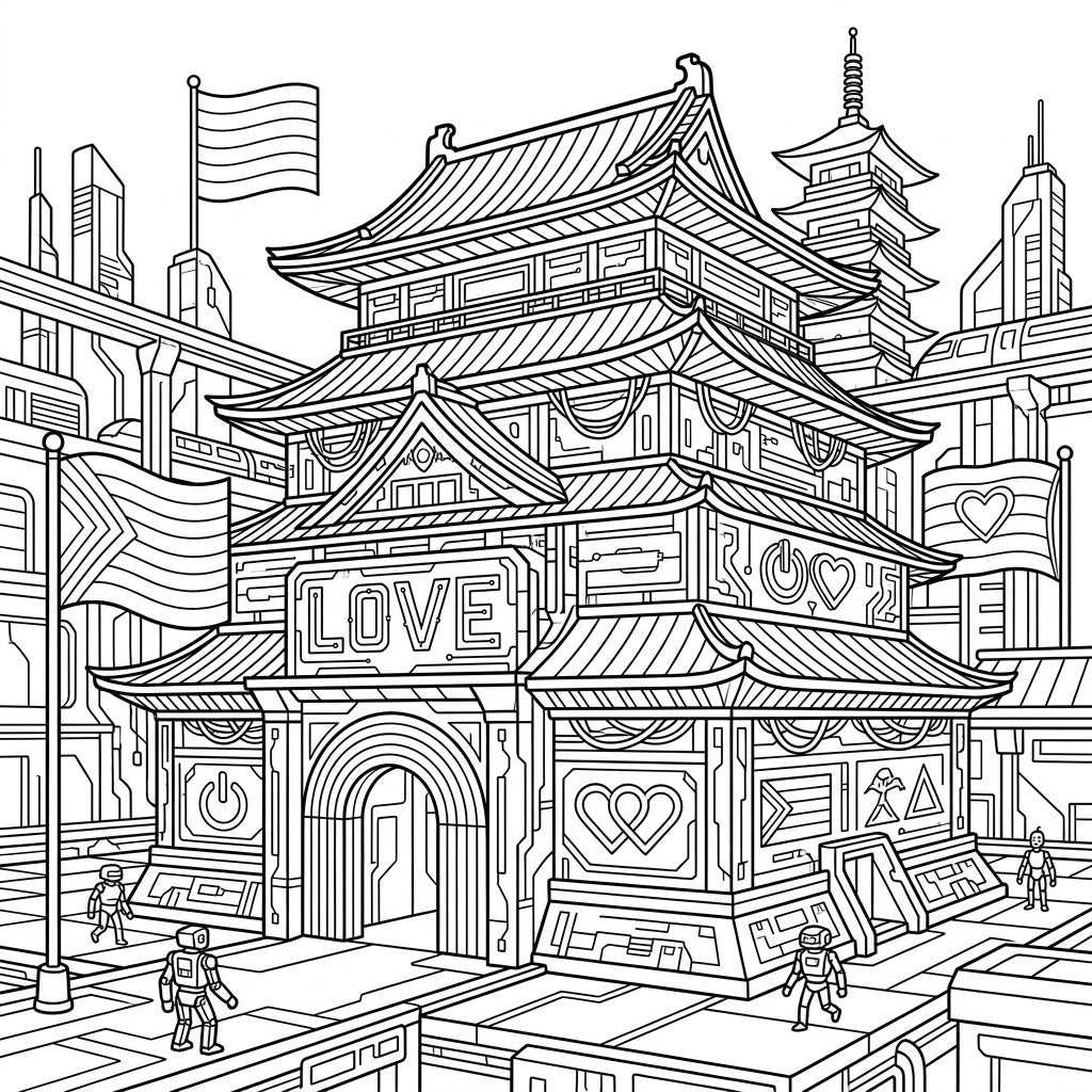 Journey into a truly unique landscape where the timeless grandeur of an ancient temple meets the cutting edge of a cyberpunk metropolis. This intricate coloring page showcases a multi-tiered temple, its traditional architecture adorned with futuristic details like complex wiring patterns, circuit boards, and glowing 'LOVE' signage above its grand archway. Robotic figures patrol the stylized streets, while sleek skyscrapers rise in the background, all rendered with meticulous line art ready for your artistic vision.