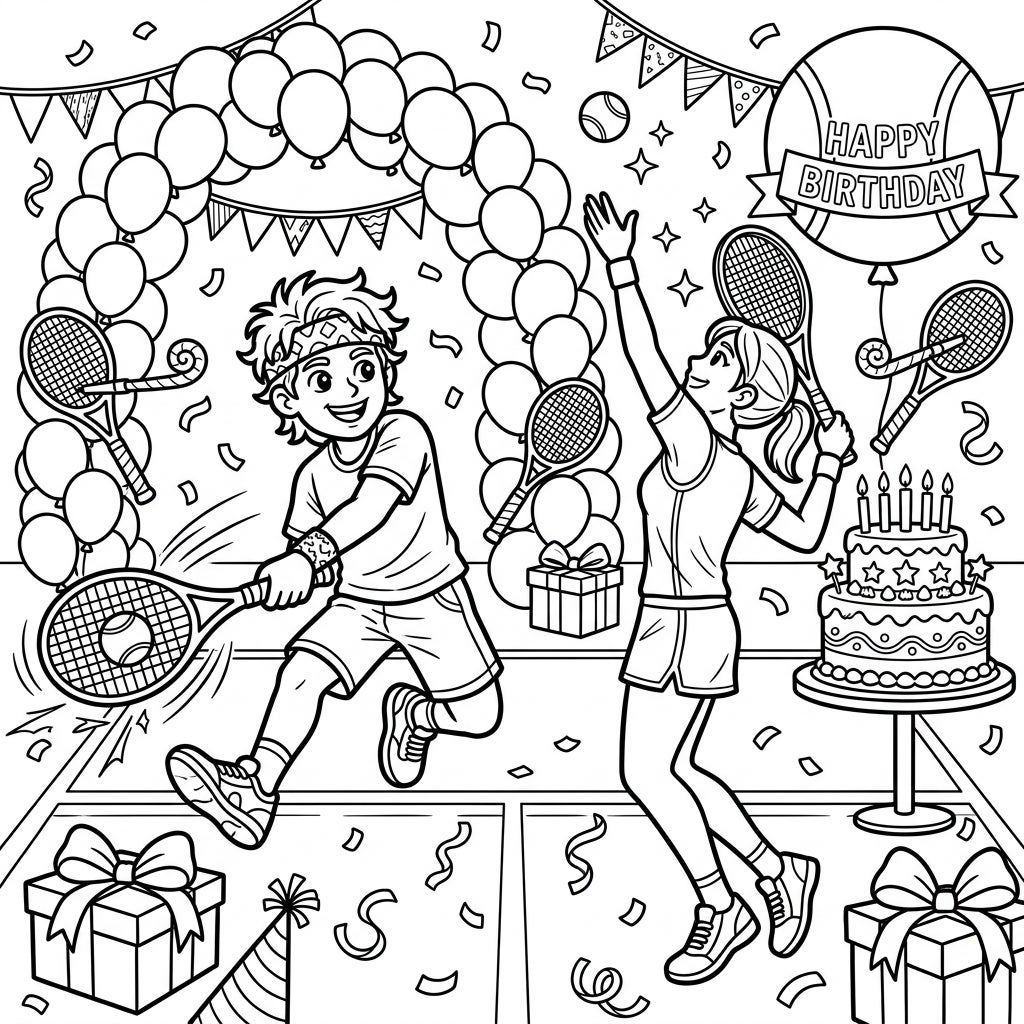 Celebrate with an ace! This dynamic coloring page features tennis players enjoying a lively birthday party on the court, surrounded by festive decorations.