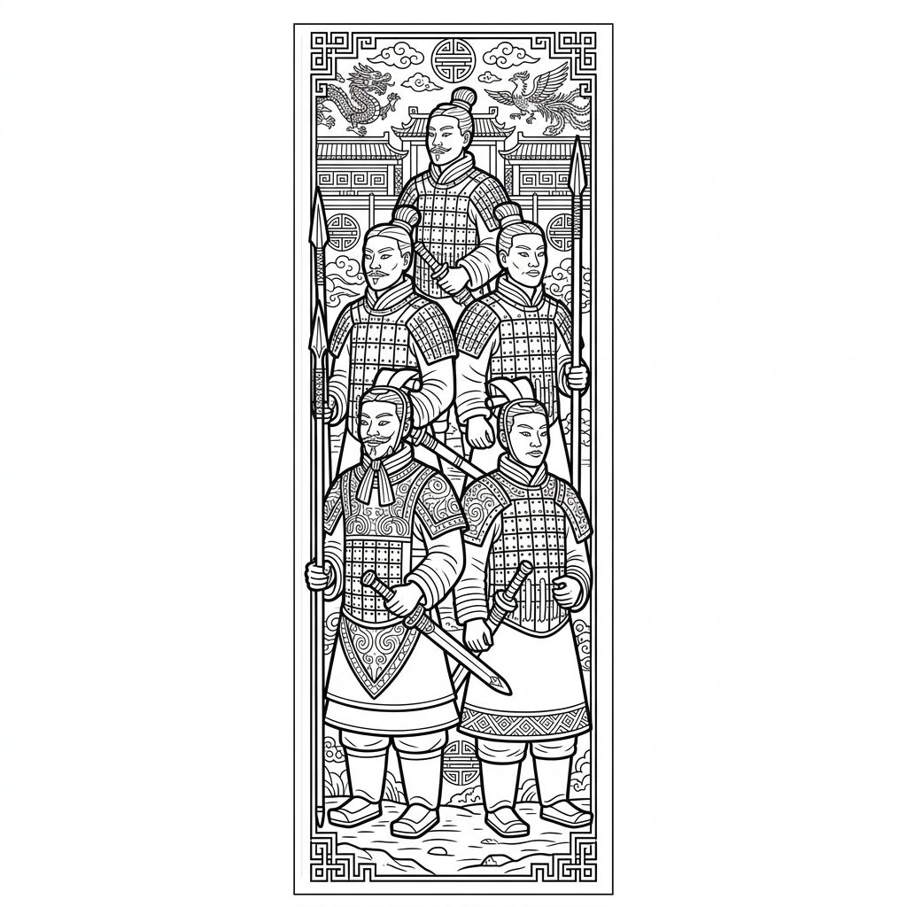 Step back in time to the Qin Dynasty with this exquisitely detailed Terracotta Army coloring bookmark. This vertical composition showcases five stoic warriors, each adorned in intricate armor patterns, holding spears and swords. Above them, traditional Chinese architecture, featuring pagoda-like roofs, is flanked by majestic dragons and phoenixes amidst swirling clouds, all framed by classic geometric borders, offering a rich tapestry of historical design.