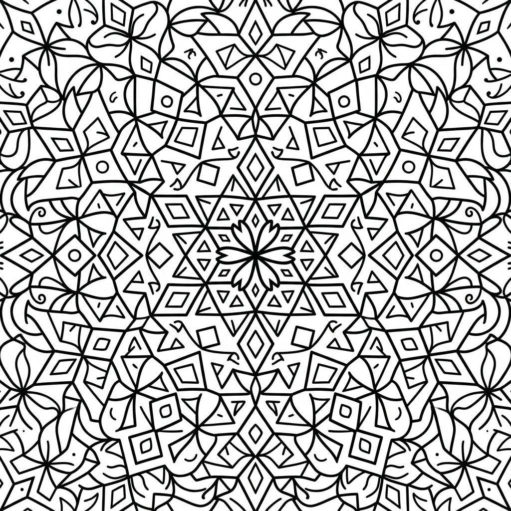 Dive into a mesmerizing world of patterns with this intricate tessellation mandala coloring page. Designed specifically for children, it showcases a stunning array of geometric shapes like triangles, squares, and diamonds, seamlessly interwoven with elegant, floral-like motifs. The entire design radiates outwards from a central point, creating a complex yet harmonious visual that fills the page with opportunities for artistic expression. Thick, clean black outlines define each segment, providing clear boundaries for young artists to fill with their favorite colors.