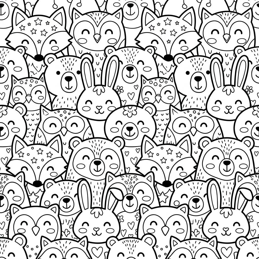 Unleash your child's imagination with this charming tessellation coloring page, showcasing a bustling scene of their favorite forest friends! This intricate yet kid-friendly design features an array of cuddly animals like playful foxes, huggable bears, wise owls, and bouncy bunnies, all cleverly interlocking to form a continuous, seamless pattern. Each character is rendered with sweet, smiling faces and simple, bold lines, making it a joy for little hands to color.
