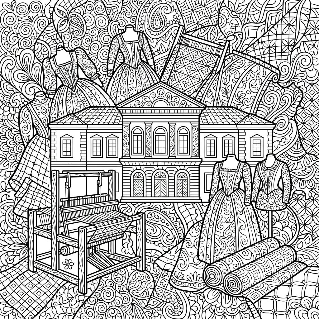 Step into a world of woven wonders with this intricate Zentangle textile museum coloring page. Discover beautifully detailed historical garments, looms, and fabric patterns, all waiting for your creative touch.
