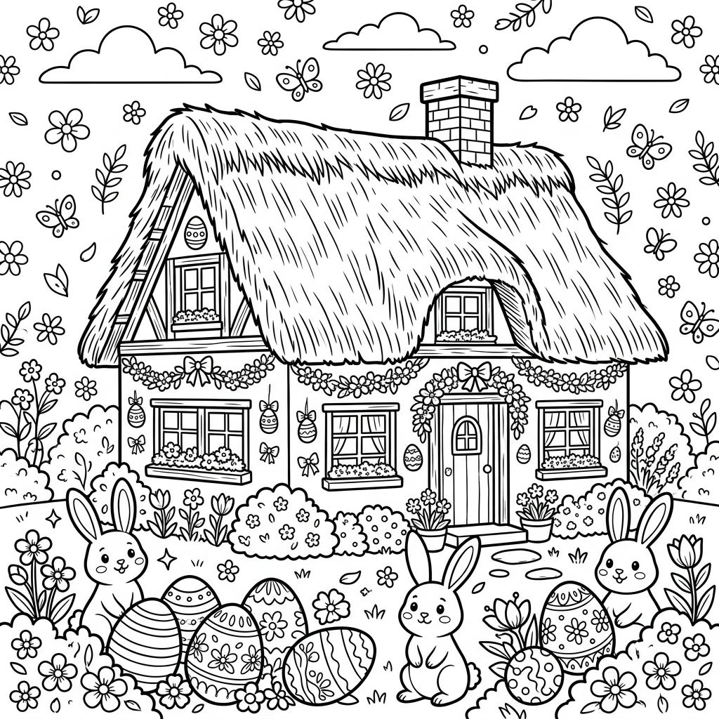 Step into a delightful Easter dream with this intricate coloring page featuring a picturesque thatched cottage. Every detail invites your artistic flair, from the rustic texture of the straw roof to the quaint windows blooming with window box flowers. Discover garlands draped across the cottage facade, adorned with bows and charming hanging Easter eggs, ready to be brought to life with your favorite colors. This scene perfectly blends traditional charm with festive celebration.