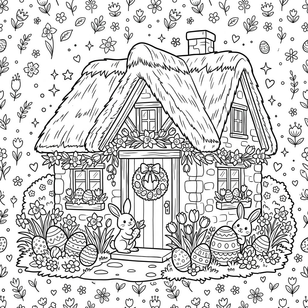 Step into a whimsical Easter scene with this adorable thatched cottage coloring page. Discover bunnies, decorated eggs, and blooming spring flowers, ready for your creative touch.