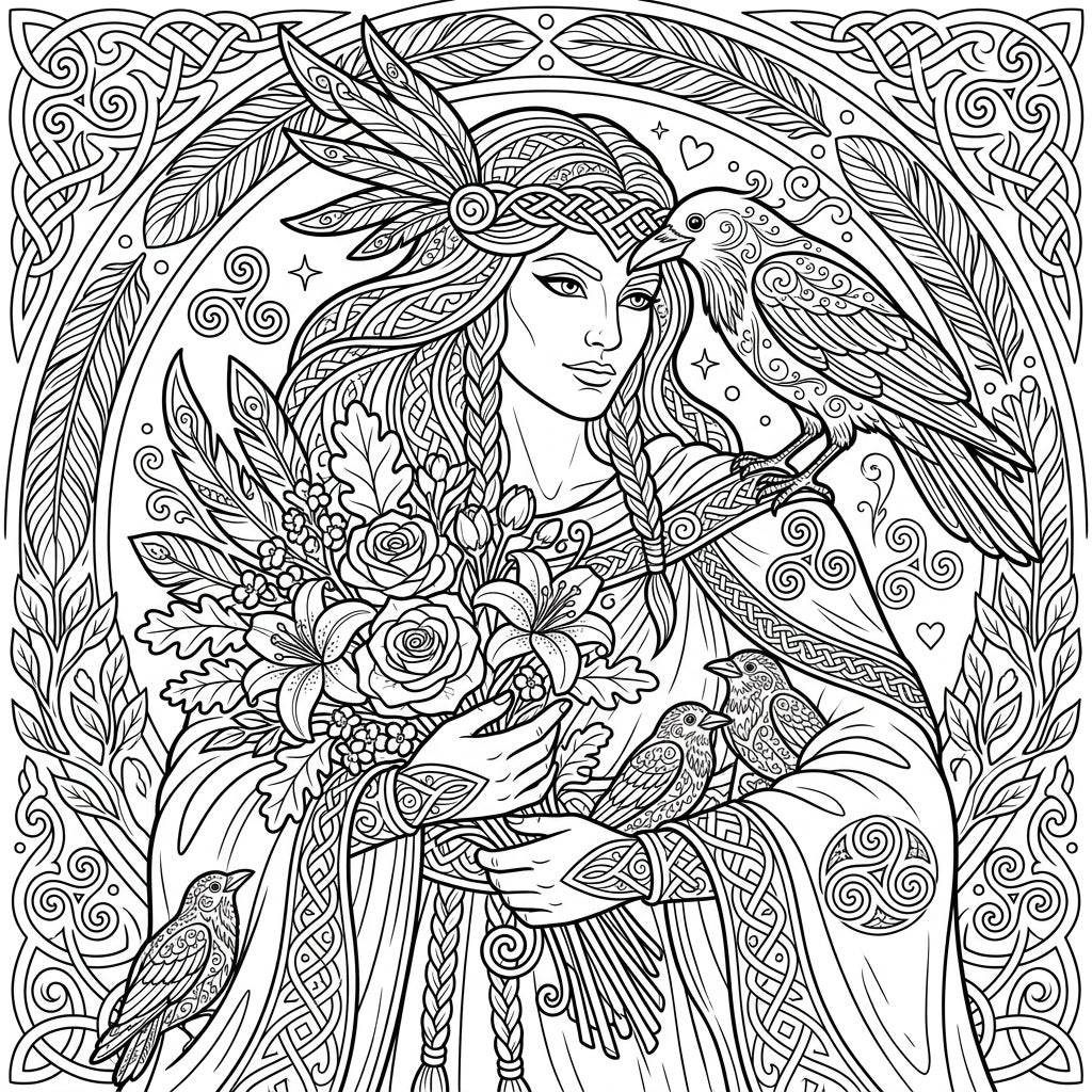 Immerse yourself in the rich details of this striking coloring page, showcasing The Morrígan, the enigmatic Celtic goddess. She is depicted with flowing, intricately braided hair and an ornate feathered headpiece, her gaze both powerful and serene. Her robes are adorned with classic Celtic knotwork, adding depth and authenticity to her divine presence. In her arms, she cradles a lush bouquet of roses, lilies, and diverse foliage, symbolizing beauty and rebirth, while a grand raven perches regally on her shoulder, accompanied by two smaller birds, emphasizing her connection to nature and the spiritual realm. The entire scene is framed by a majestic arch embellished with swirls, feathers, and triskelion symbols, inviting a truly immersive coloring experience.
