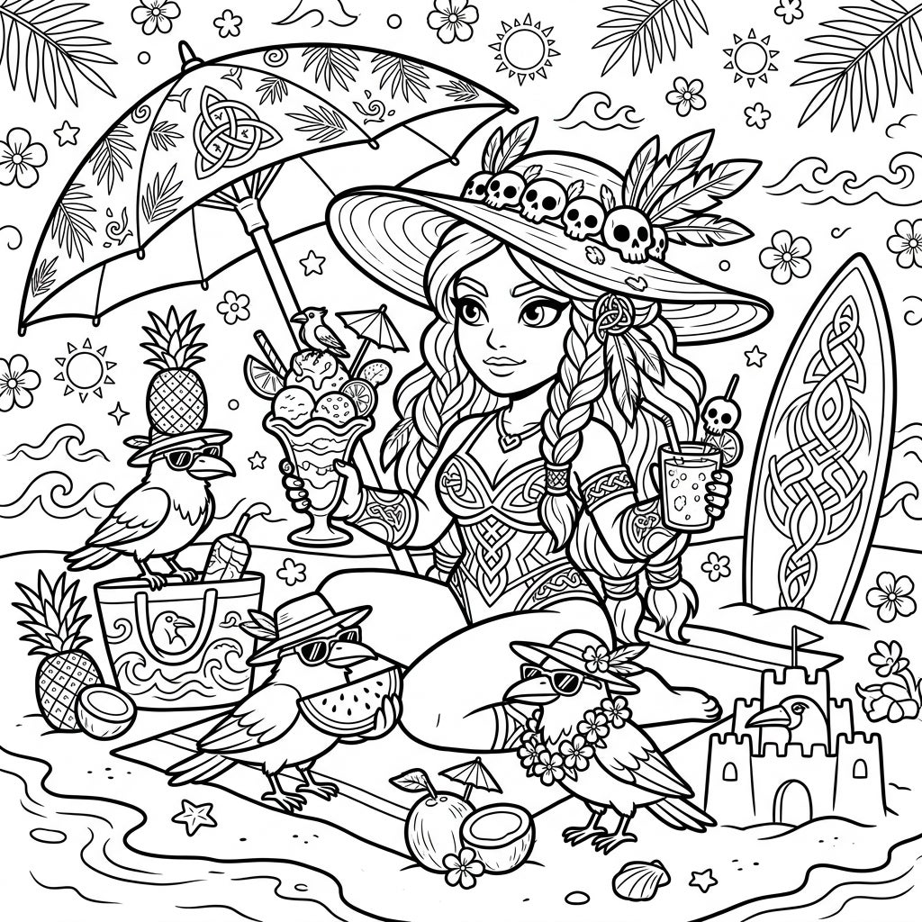 Embark on a mythical journey to the beach with this exquisitely detailed coloring page featuring The Morrígan, the formidable Celtic goddess, unwinding in a truly unique summer setting. Adorned in an intricately patterned swimsuit reminiscent of ancient armor, she sports a wide-brimmed hat decorated with skulls and feathers, her long braided hair flowing beside her. Her loyal crow companions are also in holiday mode, one sporting cool sunglasses and a pineapple hat, another enjoying a slice of watermelon, and a third adorned with a tropical lei. The scene is rich with elements like a Celtic knot-patterned umbrella, a matching surfboard, a charming sandcastle, refreshing tropical drinks, coconuts, and pineapples, all waiting for your vibrant palette.