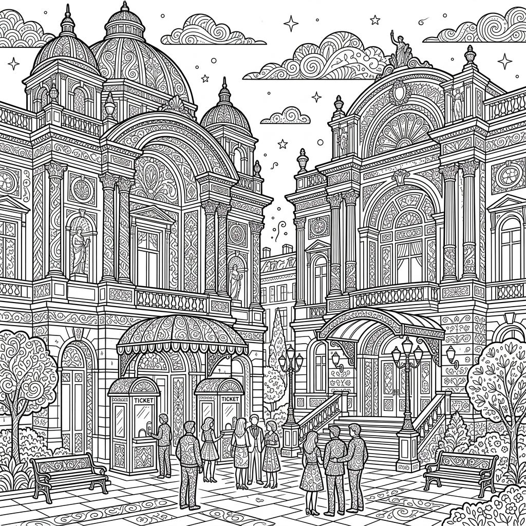 Unleash your creativity with this stunning coloring template showcasing a majestic street scene centered around two grand theaters. Marvel at the intricate architectural details, from stately domes and elegant columns to ornate balconies and delicate facade patterns, all masterfully rendered in the mesmerizing Zentangle style. Observe the lively scene outside, where people gather near ticket booths and stroll along the patterned cobblestone path, surrounded by benches, lampposts, and trees, creating a vibrant yet peaceful composition.