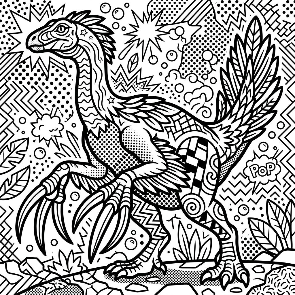 Dive into the prehistoric world with a vibrant Pop Art twist! This unique coloring page features a fascinating Therizinosaurus, ready for your artistic touch.