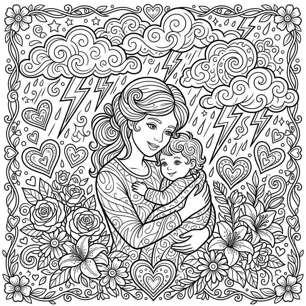 This unique design masterfully blends the raw power of a thunderstorm with the gentle warmth of a mother's embrace, symbolizing the unwavering strength and protective nature of maternal love, even amidst life's challenges. It’s a powerful metaphor for how a mother's affection can be a constant source of comfort and beauty, transforming any storm into a backdrop for enduring love. Perfect for Mother's Day, this page offers a creative way to celebrate the extraordinary women who bring light and resilience into our lives.