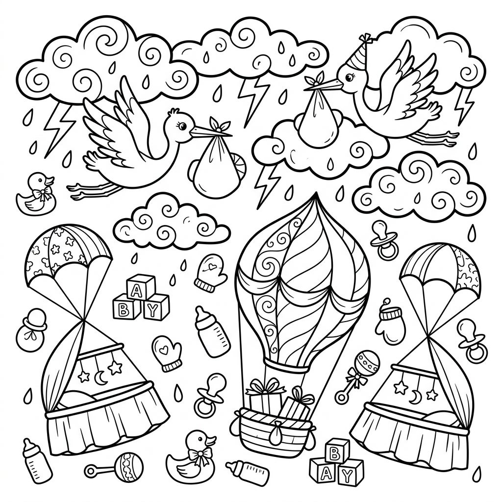 This charming coloring page brings together an unexpected yet delightful fusion of thunderstorms and a baby shower celebration. The intricate line art depicts two cheerful storks soaring through whimsical storm clouds, each carrying a precious baby bundle. Stylized lightning bolts and gentle raindrops add a unique touch to the sky, while a hot air balloon filled with presents floats peacefully amidst an array of classic baby shower essentials, creating a truly one-of-a-kind scene for colorists.