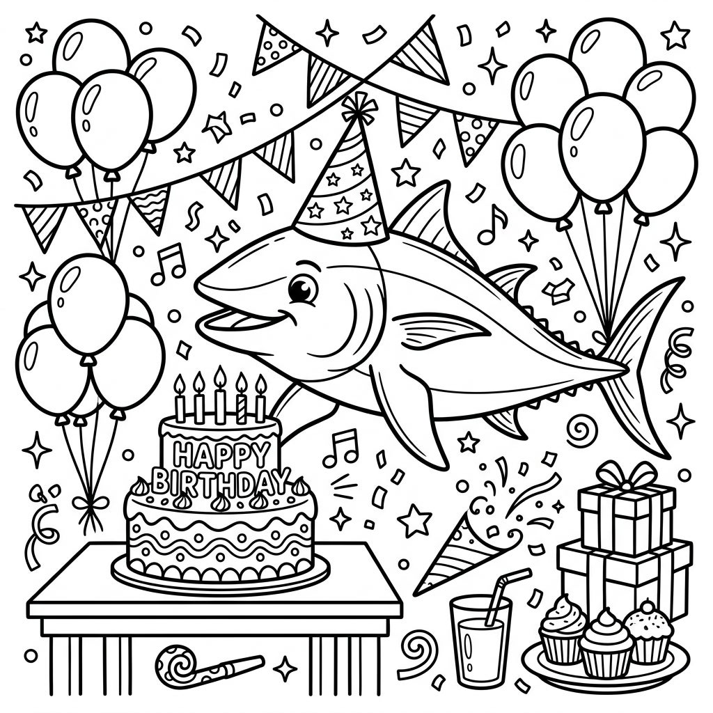 Get ready for an undersea celebration with this adorable Thunnosaurus birthday party coloring page! Join our cheerful fish friend as he enjoys cake, balloons, and all the festive fun, just waiting for your vibrant colors.
