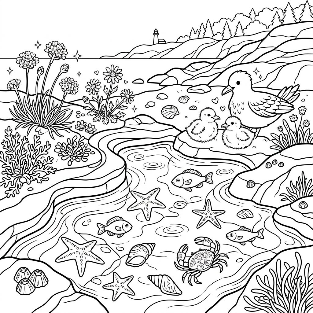 Immerse yourself in a beautifully detailed coloring page showcasing the lively world of a spring tidal pool. This intricate illustration captures a vibrant coastal scene, featuring a mother bird tending to her two adorable chicks nestled on a rocky outcrop. The crystal-clear waters of the tidal pool are teeming with fascinating marine life, including various starfish, small fish, and a charming crab, all surrounded by an array of delicate seashells. Along the rugged shore, you'll discover blooming coastal plants, adding texture and beauty to the natural landscape, with a distant lighthouse and a serene forest completing the scenic background.