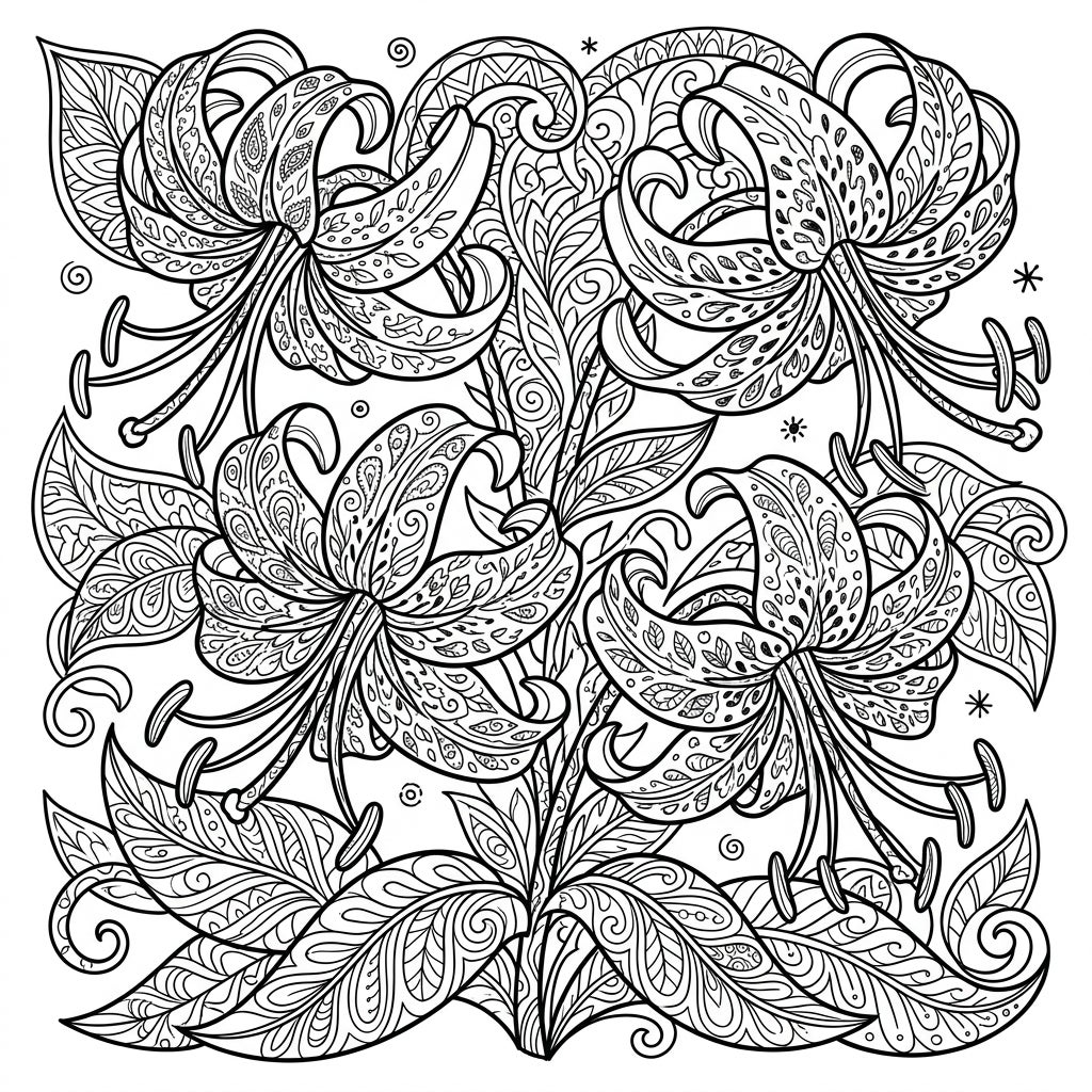 This exquisite coloring template showcases a lush bouquet of Tiger Lilies, each bloom intricately designed in the mesmerizing Zentangle style. Observe the distinct recurved petals and elegant stamens, all adorned with a rich tapestry of abstract patterns, squiggles, and dots that flow seamlessly into the surrounding leaves and swirling botanical elements. Every inch of this design invites a deep dive into detailed coloring, transforming the page into a canvas of endless artistic possibilities.