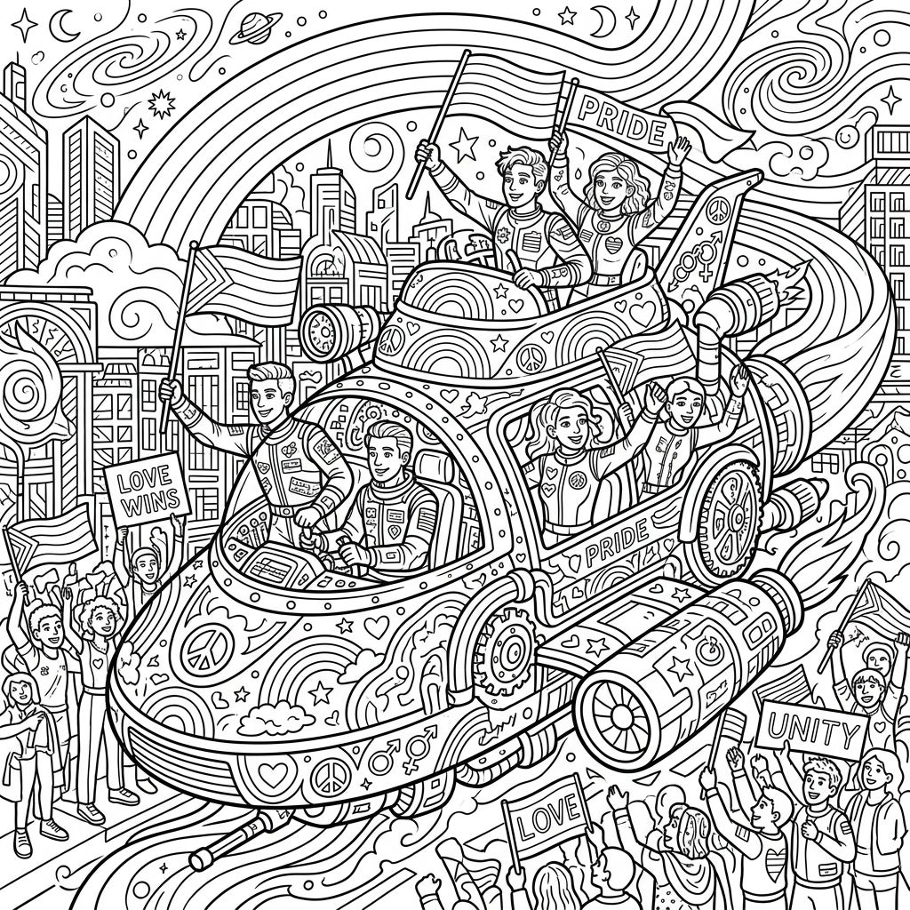Embark on an epic journey with our diverse Time Machine Pilots as they celebrate Pride Month! This vibrant coloring page combines futuristic travel with heartwarming symbols of love and unity, perfect for an engaging coloring session.