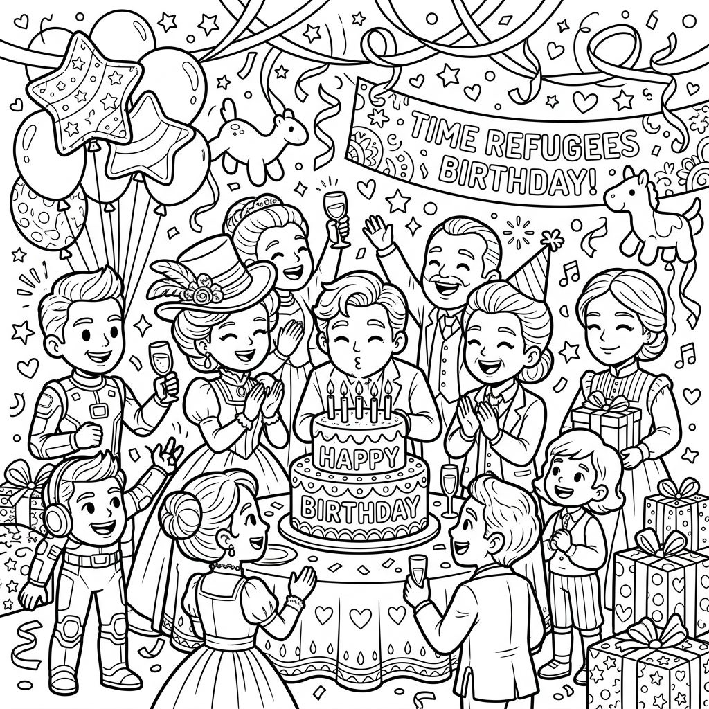 Join the joyous celebration as Time Refugees from across history gather for an unforgettable birthday party. This fun coloring page features diverse characters, festive decorations, and a delicious cake, ready for your creative touch.