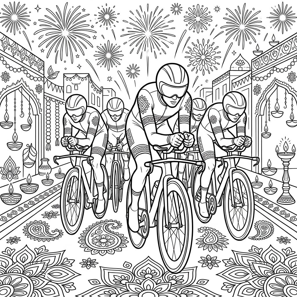Experience a unique blend of speed and tradition with this captivating coloring page featuring time trial cyclists amidst a vibrant Diwali celebration. Intricate rangoli patterns and dazzling fireworks set the scene for an unforgettable artistic journey.