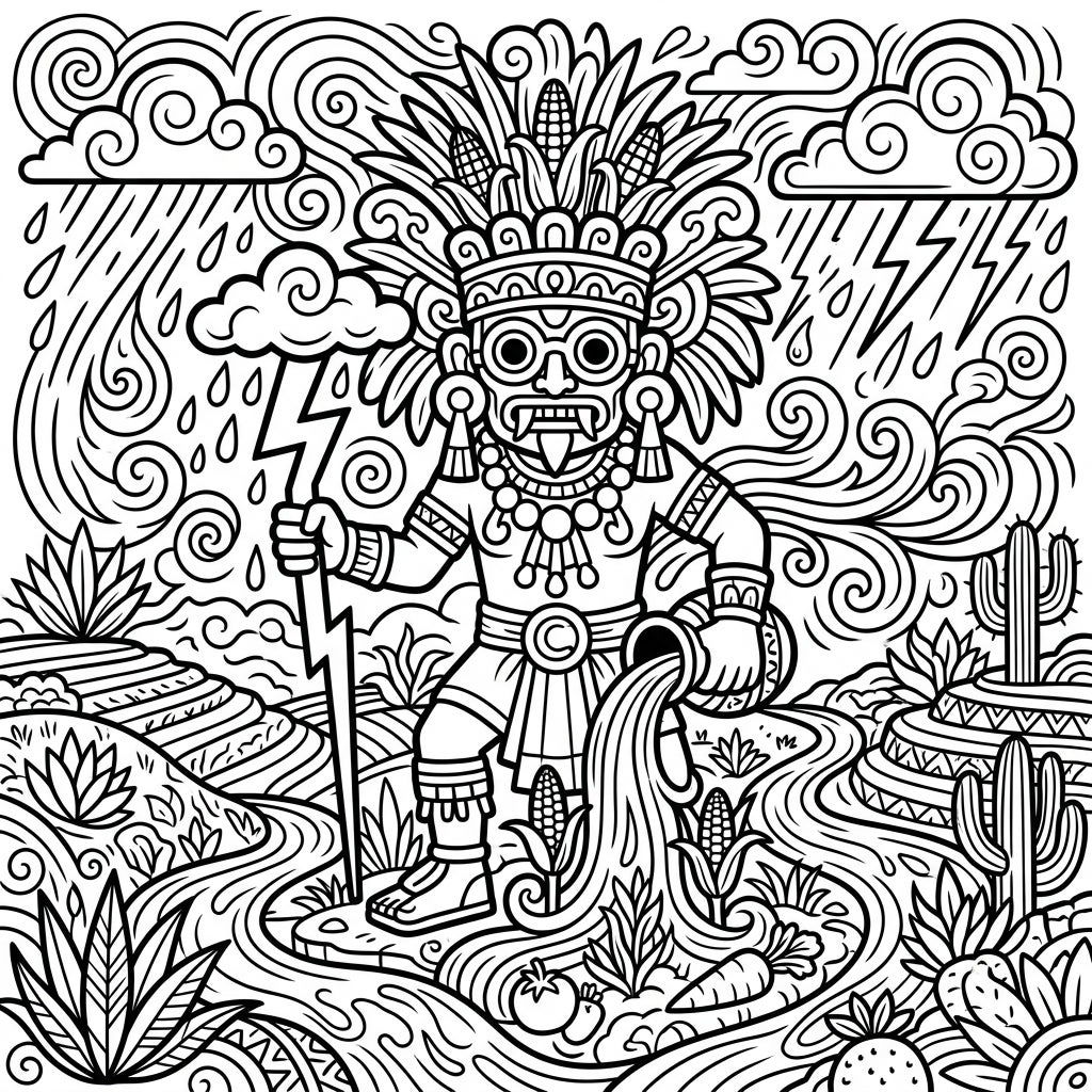This coloring page invites you to delve deep into the captivating realm of Aztec mythology and explore the profound significance of Tlaloc. As the revered god of rain, fertility, and water, Tlaloc was absolutely crucial for ensuring agricultural abundance and sustaining life itself, yet he also commanded the raw power of dramatic storms. The scene perfectly captures his dual nature, overseeing both the nourishing rains that foster lush crops and the awe-inspiring force of the elements. It serves as a vibrant homage to ancient cultures and their intrinsic, deep-seated connection to the natural world.