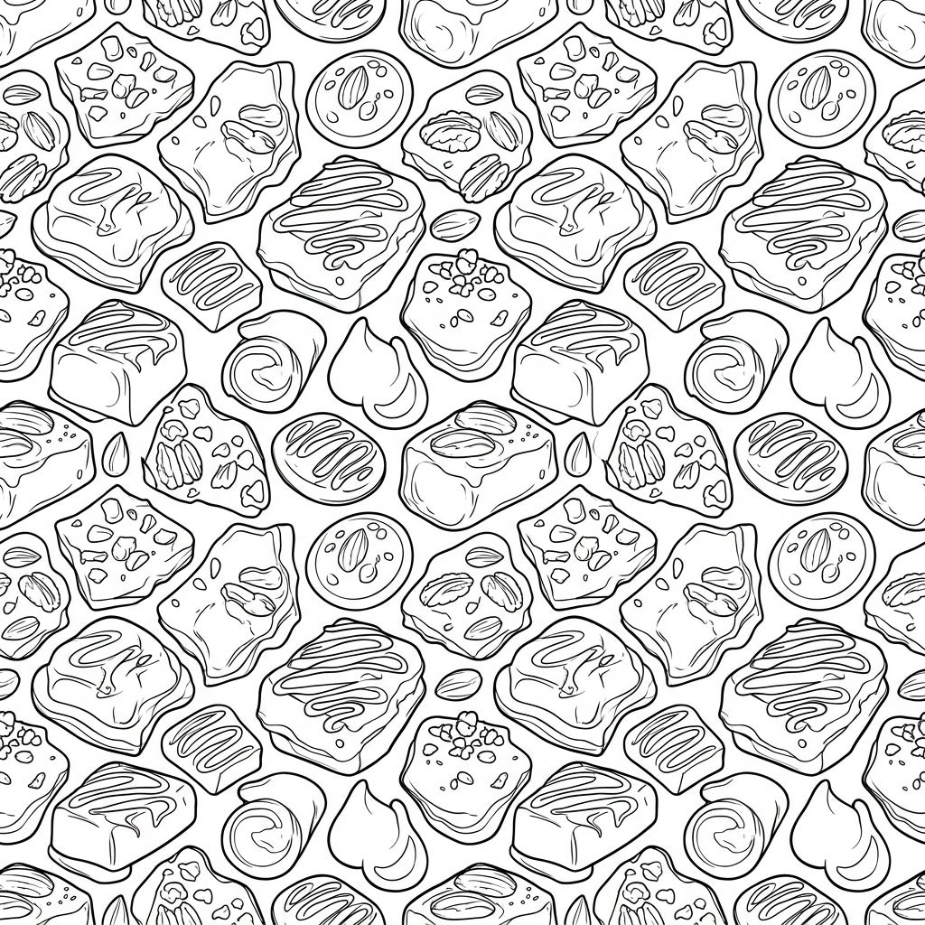 Perfect for anyone with a sweet tooth or those seeking a deliciously relaxing coloring experience, this pattern evokes the cozy comfort of a candy shop. Imagine the warm, golden hues of caramel, the rich browns of chocolate, and the earthy tones of nuts coming to life under your pencils or markers. It's an ideal activity for unwinding after a long day, a creative break, or simply to indulge in the simple pleasure of bringing color to life.
