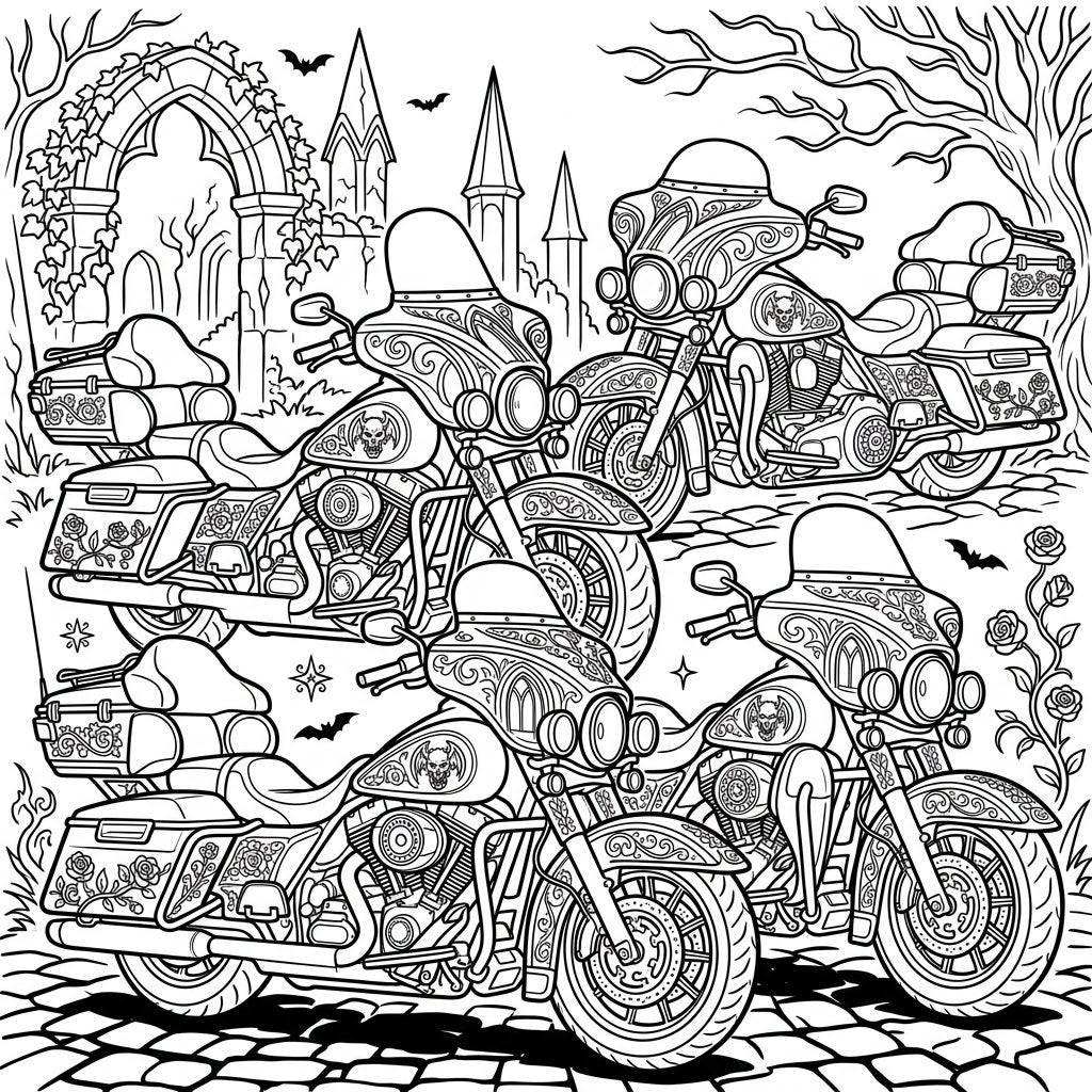 Prepare to be captivated by this extraordinary coloring template, where the rugged grandeur of touring motorcycles is reimagined through a darkly elegant Gothic lens. Each of the four bikes is a masterpiece of intricate detail, featuring custom fairings and saddlebags emblazoned with ornate Victorian-inspired scrollwork, macabre skull emblems, and thorny rose motifs. The complex mechanics of these road legends are interwoven with dramatic, melancholic artistry, promising an absorbing coloring experience for enthusiasts of both motorcycling and dark aesthetics.