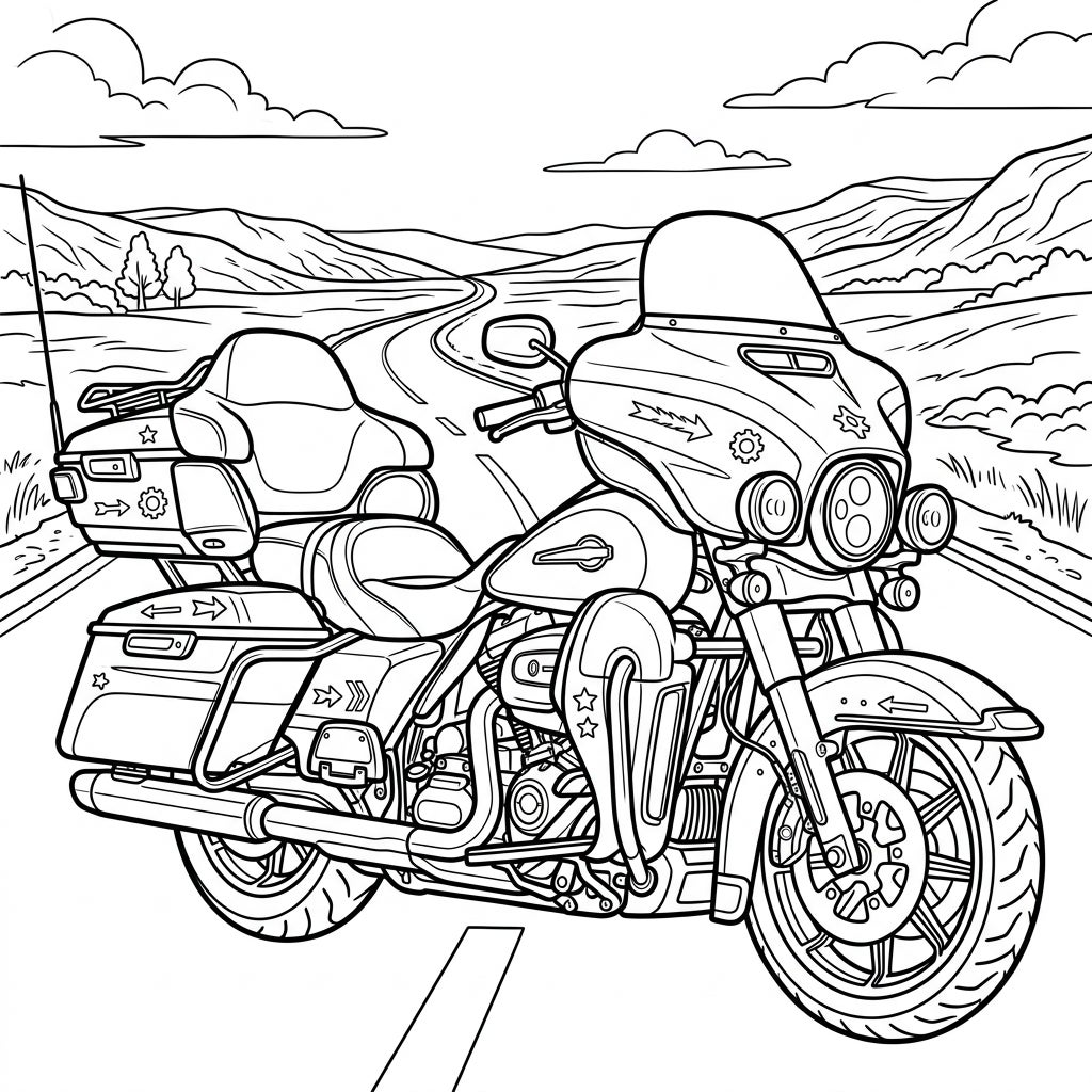 Imagine the freedom of the open road as you color this magnificent machine. The background sets the scene with a winding highway stretching into a distant horizon, flanked by rolling hills and a scattering of clouds, evoking the true spirit of adventure and exploration. This template isn't just about coloring a motorcycle; it's about capturing the essence of a journey, the thrill of discovery, and the serene beauty of the landscape passing by. It’s a perfect escape for anyone who dreams of endless rides and breathtaking vistas.