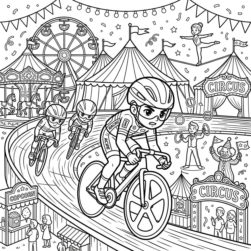 Experience the thrill of a high-speed track cycling race set amidst the vibrant excitement of a carnival! This detailed coloring page invites you to bring a world of movement, daring feats, and festive energy to life with your favorite colors.