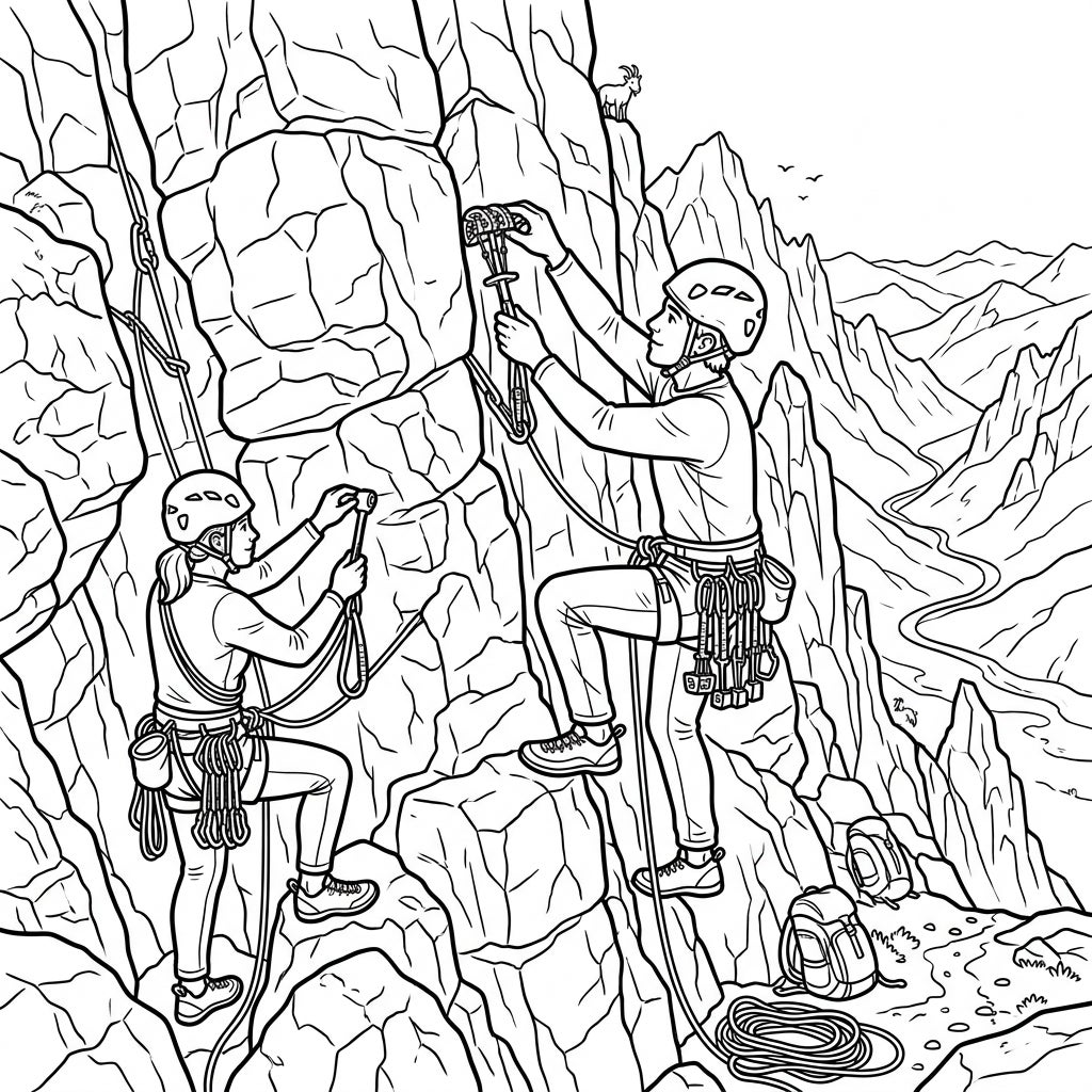 Get ready for an epic journey with our Traditional Climbers coloring page, perfect for young adventurers learning about the thrill of rock climbing. Explore a detailed scene featuring two climbers and their essential gear, set against a stunning mountain backdrop.