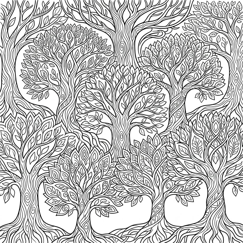 This exquisite coloring template presents a sprawling, interconnected forest of trees, their roots, trunks, branches, and countless leaves forming a captivating mosaic. Each element is rendered in pure black line art, showcasing thick, clean outlines that emphasize the organic textures of bark and the delicate veins of foliage. The entire canvas is thoughtfully filled, creating a rich visual experience that invites deep engagement and creative exploration.