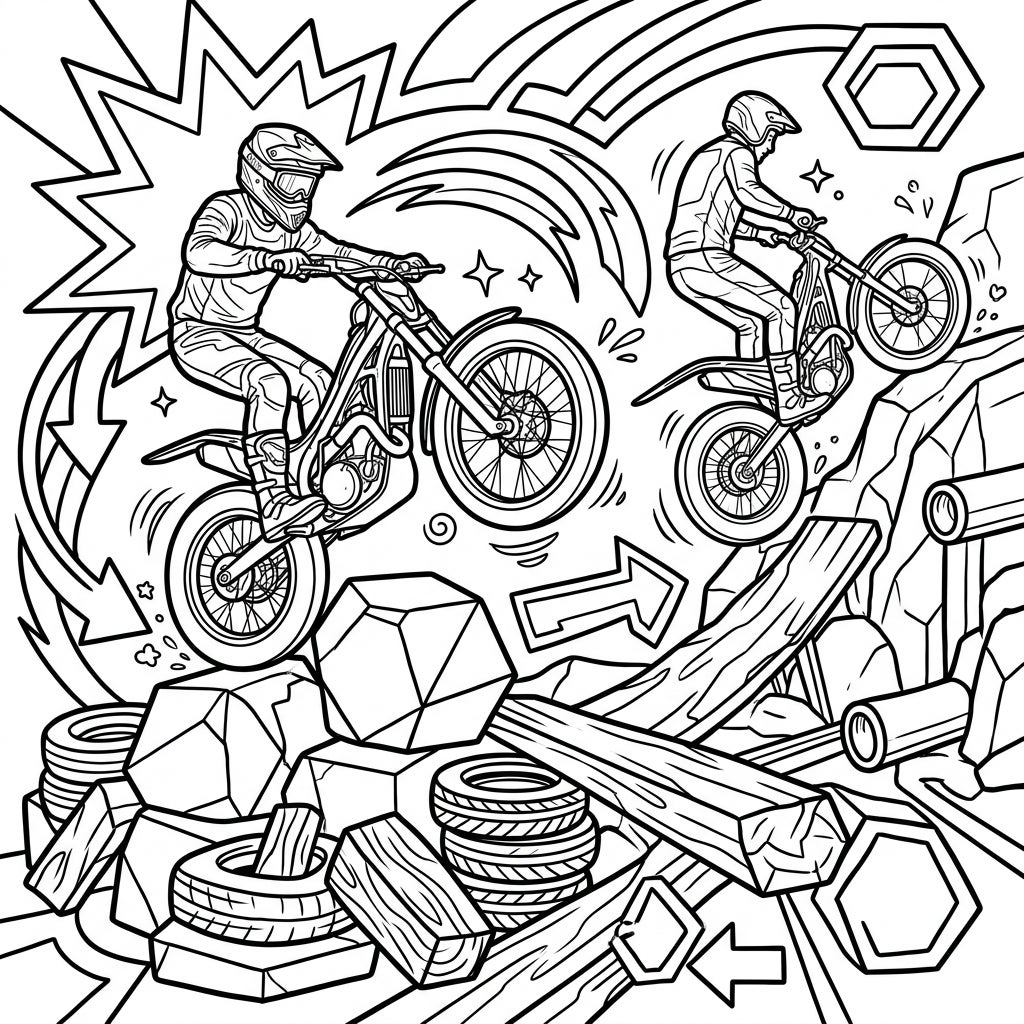 Dive into the thrilling world of trials riding with this incredible Pop Art coloring template! Featuring two agile riders on their specialized motorcycles, the scene captures them mid-action as they skillfully navigate a complex obstacle course built from rugged rocks, sturdy logs, and stacked tires. The bold outlines and dynamic background elements, characteristic of Pop Art, amplify the sense of movement and excitement.
