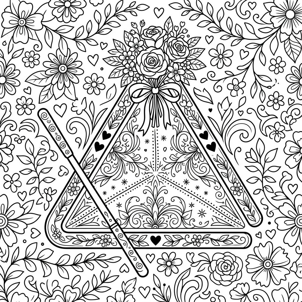 Dive into a world of intricate beauty with this unique Mother's Day coloring page, featuring a beautifully stylized musical triangle. The central instrument is a canvas of delicate patterns, including swirls and stars, crowned with a bountiful bouquet of roses and smaller blossoms, all tied with an elegant ribbon. A slender beater rests across the triangle, ready to bring it to life, while the surrounding space is filled with a rich tapestry of various flowers, curling leaves, and tiny hearts, ensuring every inch offers an opportunity for creative expression.