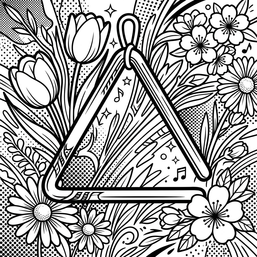 Dive into a vibrant world where music meets art with this captivating Pop Art Triangle coloring page. At its heart, a classic triangular musical instrument takes center stage, rendered with the signature bold outlines and dynamic energy of the Pop Art style. Surrounding this percussive star is a lush tapestry of spring's finest, including elegant tulips, cheerful daisies, and delicate cherry blossoms, all intertwining with graceful leaves and swirling patterns, promising a rich and engaging coloring experience.