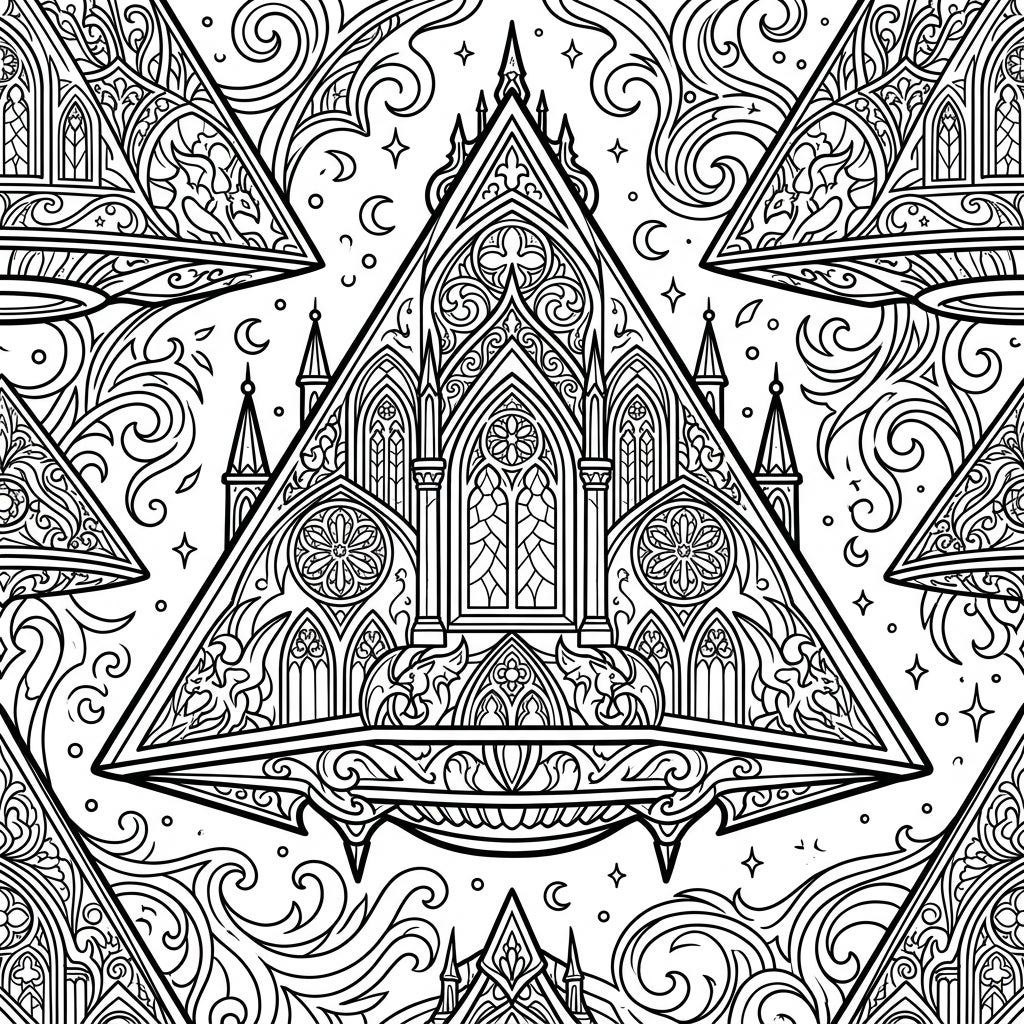 Embark on an otherworldly coloring adventure with these strikingly unique Gothic Triangular UFOs. This intricate design blends sci-fi mystery with dark, ornate aesthetics for a truly captivating artistic experience.