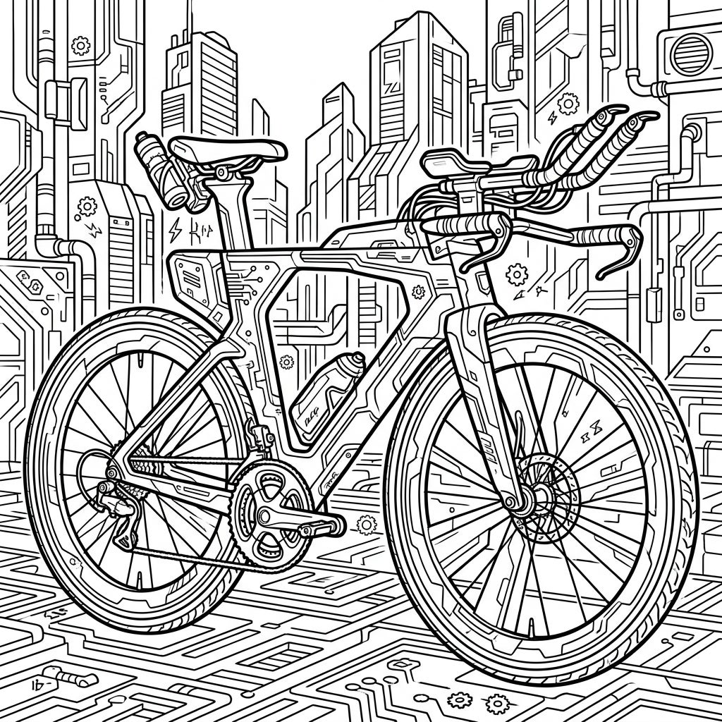 This coloring template perfectly captures the essence of a cyberpunk future, blending cutting-edge athletic engineering with a dystopian, neon-lit urban environment. Feel the thrill of speed and precision as you envision this bike navigating a high-stakes, technology-driven race. It's a tribute to the sleek power and advanced mechanics of triathlon bikes, reimagined through a lens of science fiction, inviting you to ponder the future of sport and design.