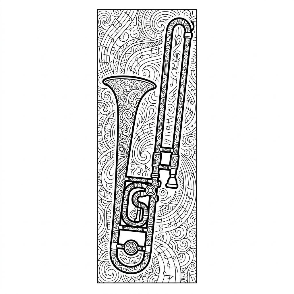 Whether you prefer vibrant tones or subtle shades, this intricate trombone bookmark invites a myriad of coloring possibilities. Experiment with metallic pens to highlight the instrument's brassy gleam or use fine-tipped markers to meticulously fill in the smaller details of the background patterns. Once colored, cut out your masterpiece, perhaps add a tassel, and enjoy a truly unique bookmark that celebrates your love for music and art.