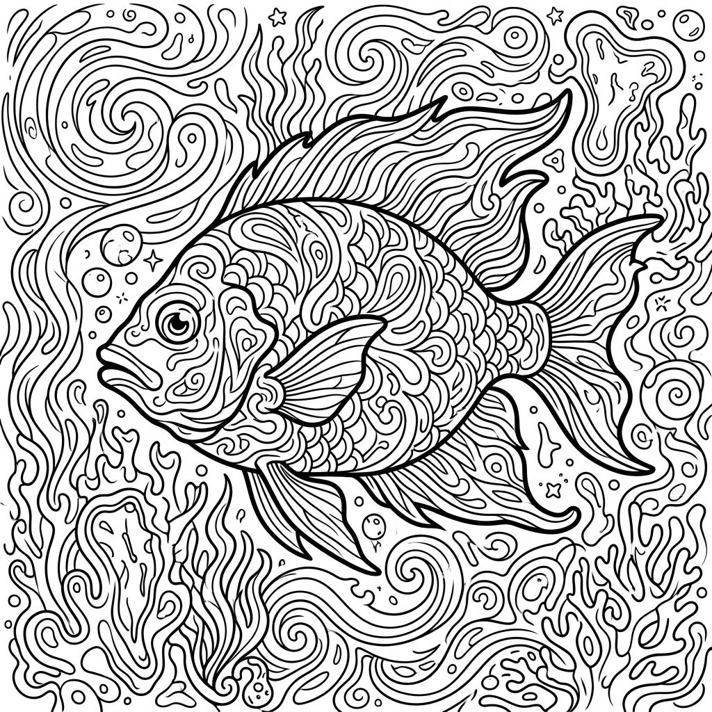 This captivating coloring page presents a stunning tropical fish, its body and fins adorned with a mesmerizing array of swirling, organic patterns. The intricate details extend across every scale and fin, inviting colorists to lose themselves in a world of complex lines. Surrounded by a dense tapestry of abstract marine elements—like stylized seaweed, undulating water currents, and whimsical bubbles—the entire composition ensures a rich and immersive artistic journey.